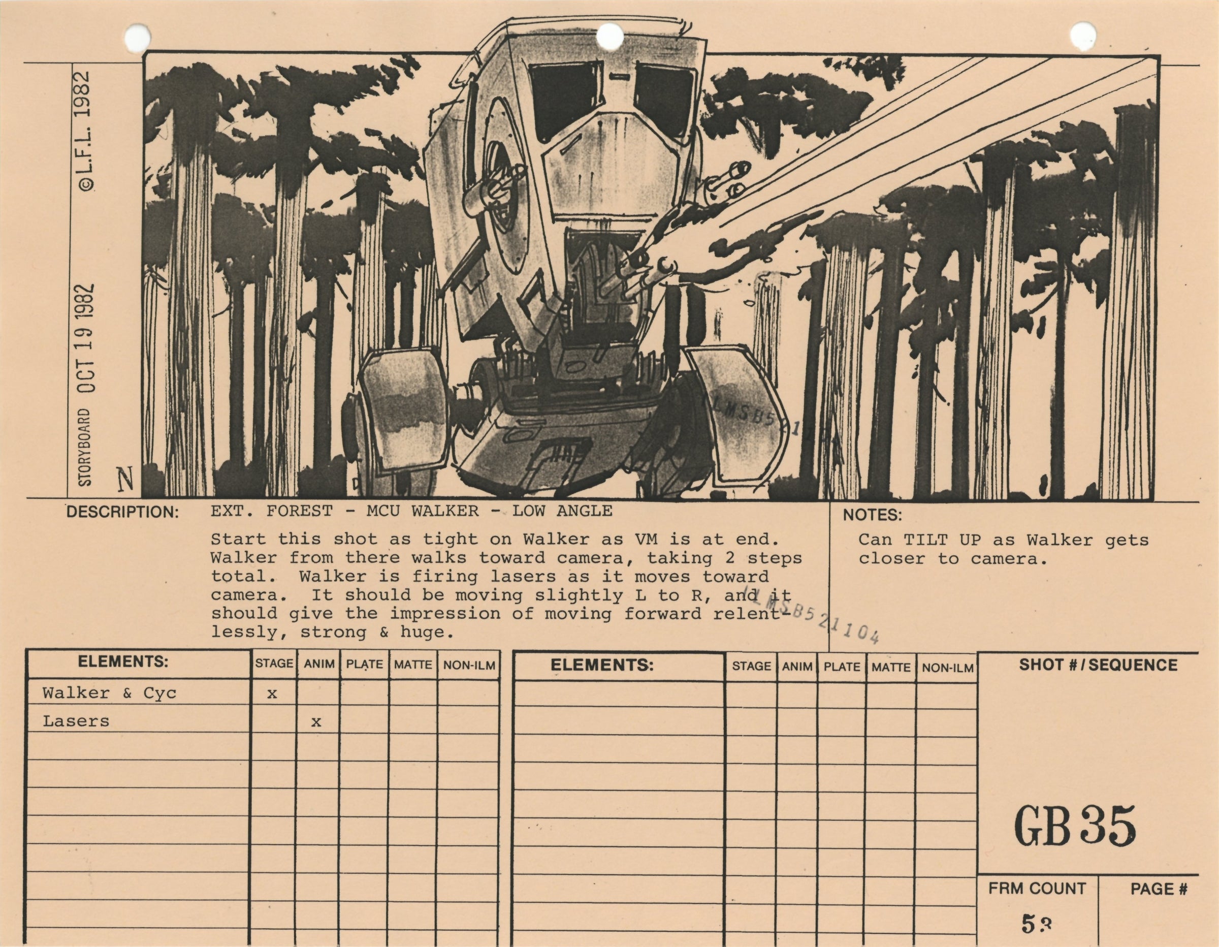 ABOUT THE ARTWORK: This photostat storyboard was used during the production of Star Wars: Episode VI - Return of the Jedi. Please note the two black "ILMSB521104" stamps as well as the 3-ring binder peg holes along the upper margin of this piece. The artist, Nilo Rodis-Jamero, is denoted by the "N" near the lower left corner of the image. Rodis-Jamero was the assistant art director of visual effects for Star Wars: Episode V - The Empire Strikes Back and costume designer for Star Wars: Episode VI - Return of the Jedi.