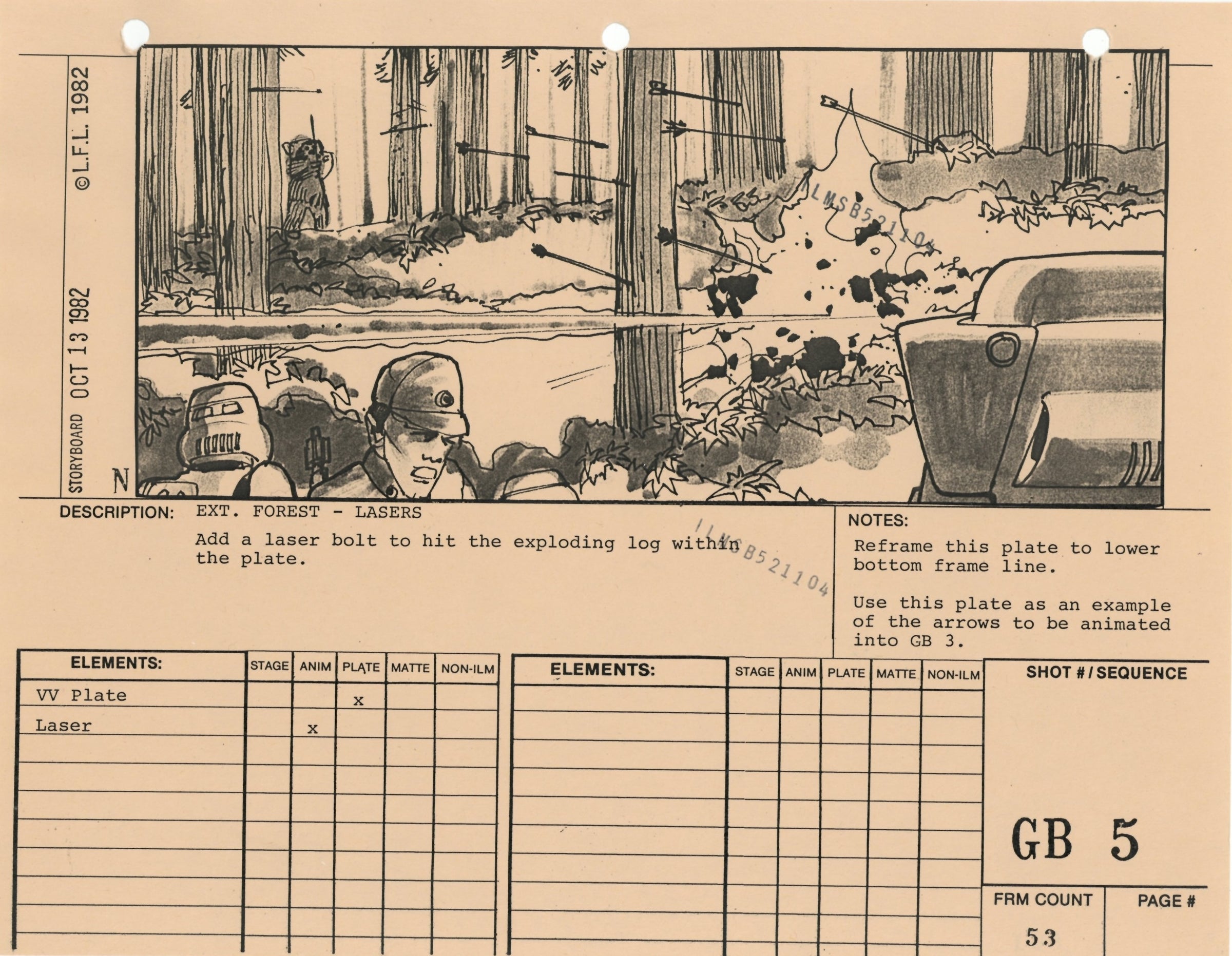 ABOUT THE ARTWORK: This photostat storyboard was used during the production of Star Wars: Episode VI - Return of the Jedi. Please note the two black "ILMSB521104" stamps as well as the 3-ring binder peg holes along the upper margin of this piece. The artist, Nilo Rodis-Jamero, is denoted by the "N" near the lower left corner of the image. Rodis-Jamero was the assistant art director of visual effects for Star Wars: Episode V - The Empire Strikes Back and costume designer for Star Wars: Episode VI - Return of the Jedi.