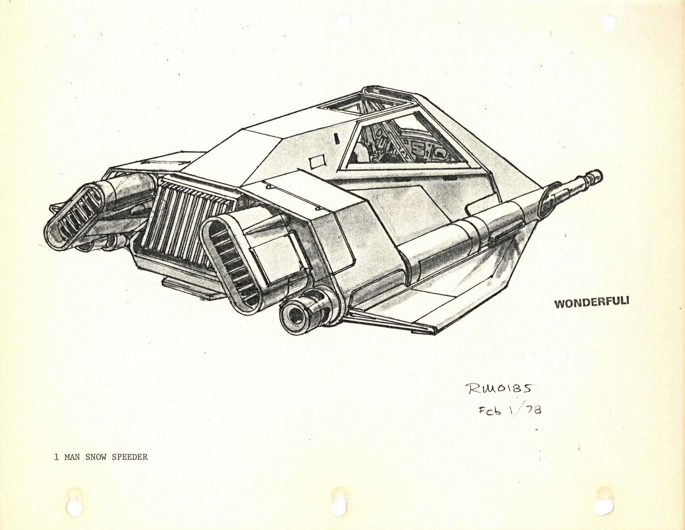 ABOUT THE IMAGE: This photostat print of an original Ralph McQuarrie drawing was used during the production of Star Wars: Episode V - The Empire Strikes Back. It showcases the back 3/4 view of a design for a one-man snow speeder, also known as a T-47 airspeeder, which is used during the Battle of Hoth. Please note the embedded production code and date in the lower right corner. A "WONDERFUL!" stamp is also visible to the right of image. There are two sets of 3-ring binder peg holes in the upper and lower margins of the piece.