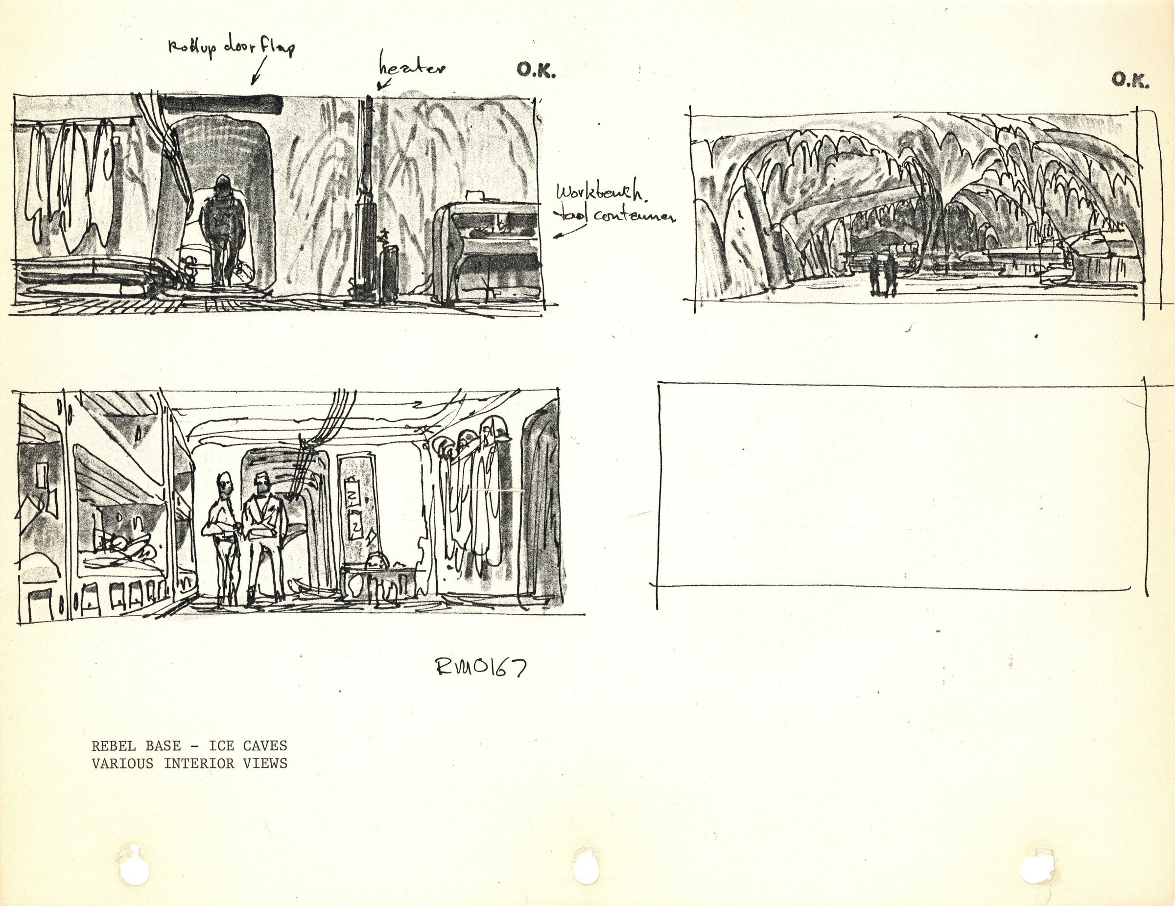ABOUT THE IMAGE: This photostat print of an original Ralph McQuarrie drawing was used during the production of Star Wars: Episode V - The Empire Strikes Back. The set concept showcases multiple views of the ice caves within the rebel base on Hoth. Please note the embedded "ok" stamps and production code in the lower left corner. There are 3-ring binder peg holes in the lower margin of the piece.