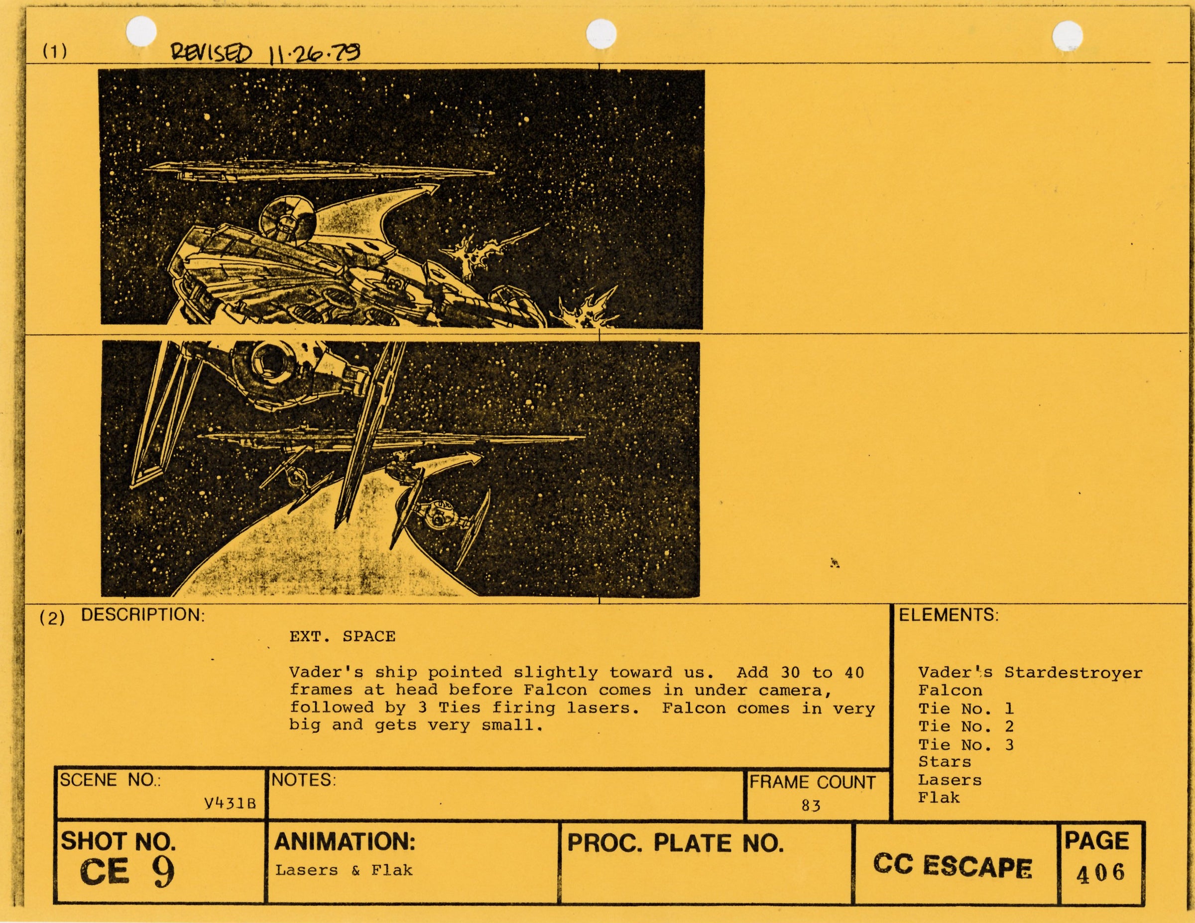 ABOUT THE ART: This storyboard print comes from the collection of award-winning miniature and optical effects artist Lorne Peterson. Peterson was invited by fellow model maker John Dykstra to work in the miniature and optical effects department of George Lucas' Star Wars: A New Hope, where he helped design and build the Star Destroyers, Imperial TIE fighters, and other classic vehicles. During pre-production, Peterson, Dykstra, and their cohort of fellow artists working under Lucas co-founded effects company Industrial Light & Magic.