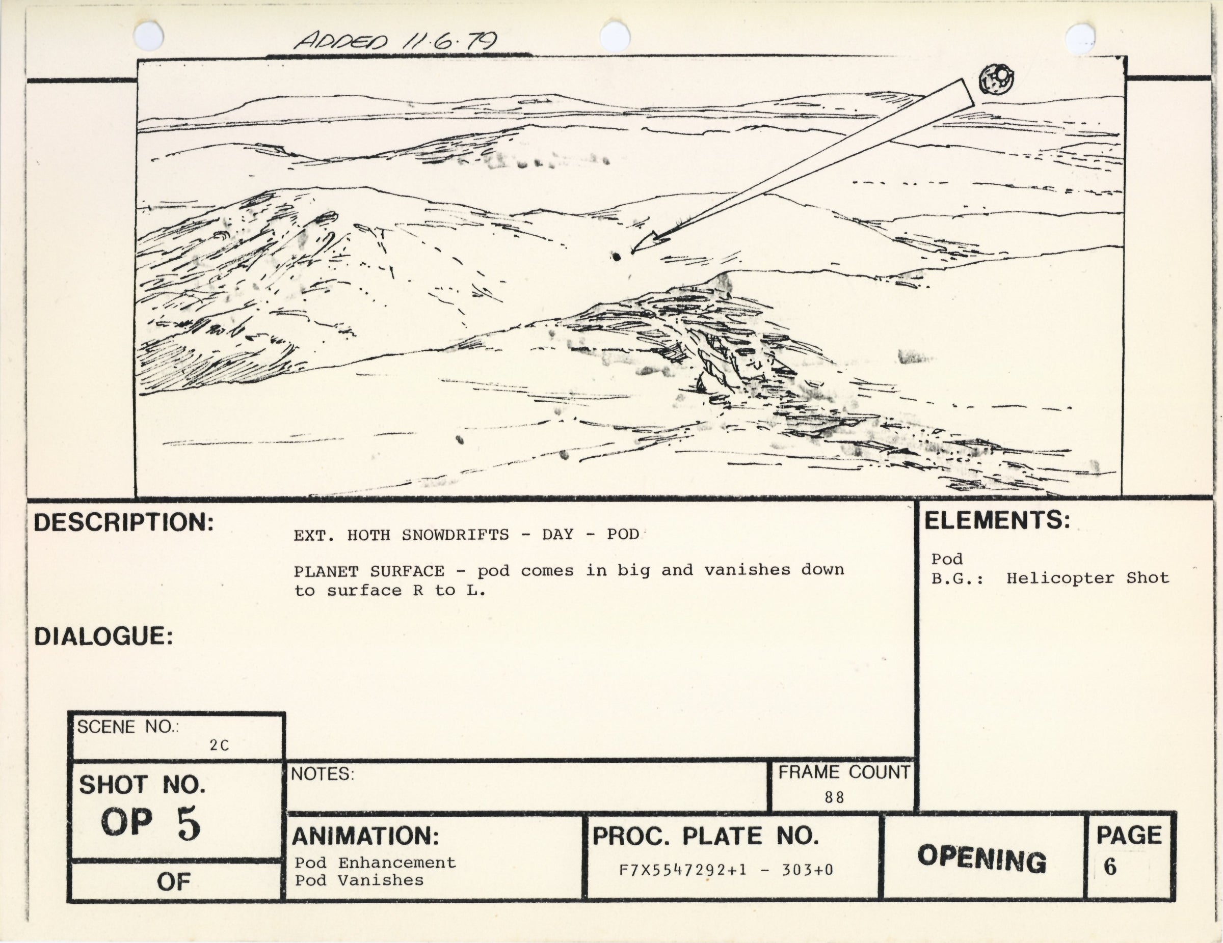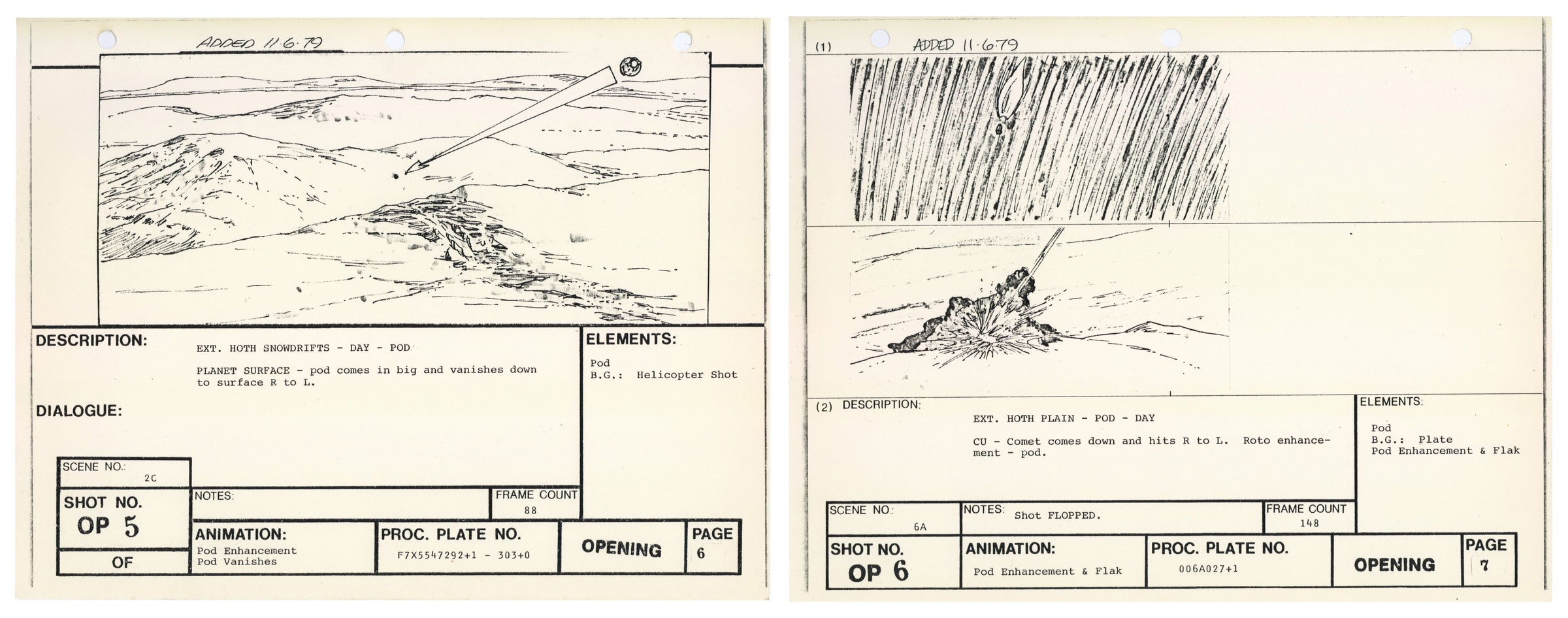 ABOUT THE ART: These storyboard prints come from the collection of award-winning miniature and optical effects artist Lorne Peterson. Peterson was invited by fellow model maker John Dykstra to work in the miniature and optical effects department of George Lucas' Star Wars: A New Hope, where he helped design and build the Star Destroyers, Imperial TIE fighters, and other classic vehicles. During pre-production, Peterson, Dykstra, and their cohort of fellow artists working under Lucas co-founded effects company Industrial Light & Magic.
