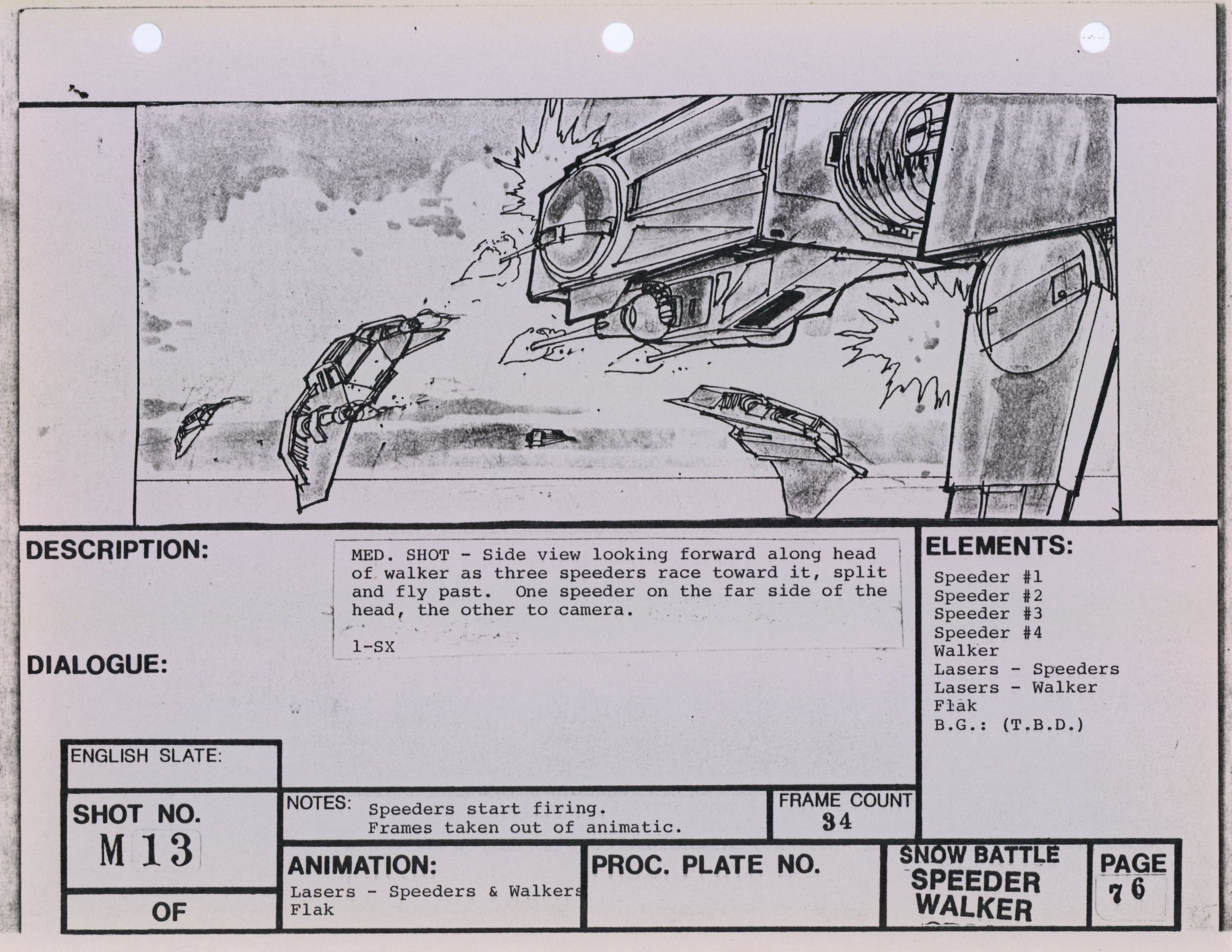 ABOUT THE ART: This storyboard print comes from the collection of award-winning miniature and optical effects artist Lorne Peterson. Peterson was invited by fellow model maker John Dykstra to work in the miniature and optical effects department of George Lucas' Star Wars: A New Hope, where he helped design and build the Star Destroyers, Imperial TIE fighters, and other classic vehicles. During pre-production, Peterson, Dykstra, and their cohort of fellow artists working under Lucas co-founded effects company Industrial Light & Magic.