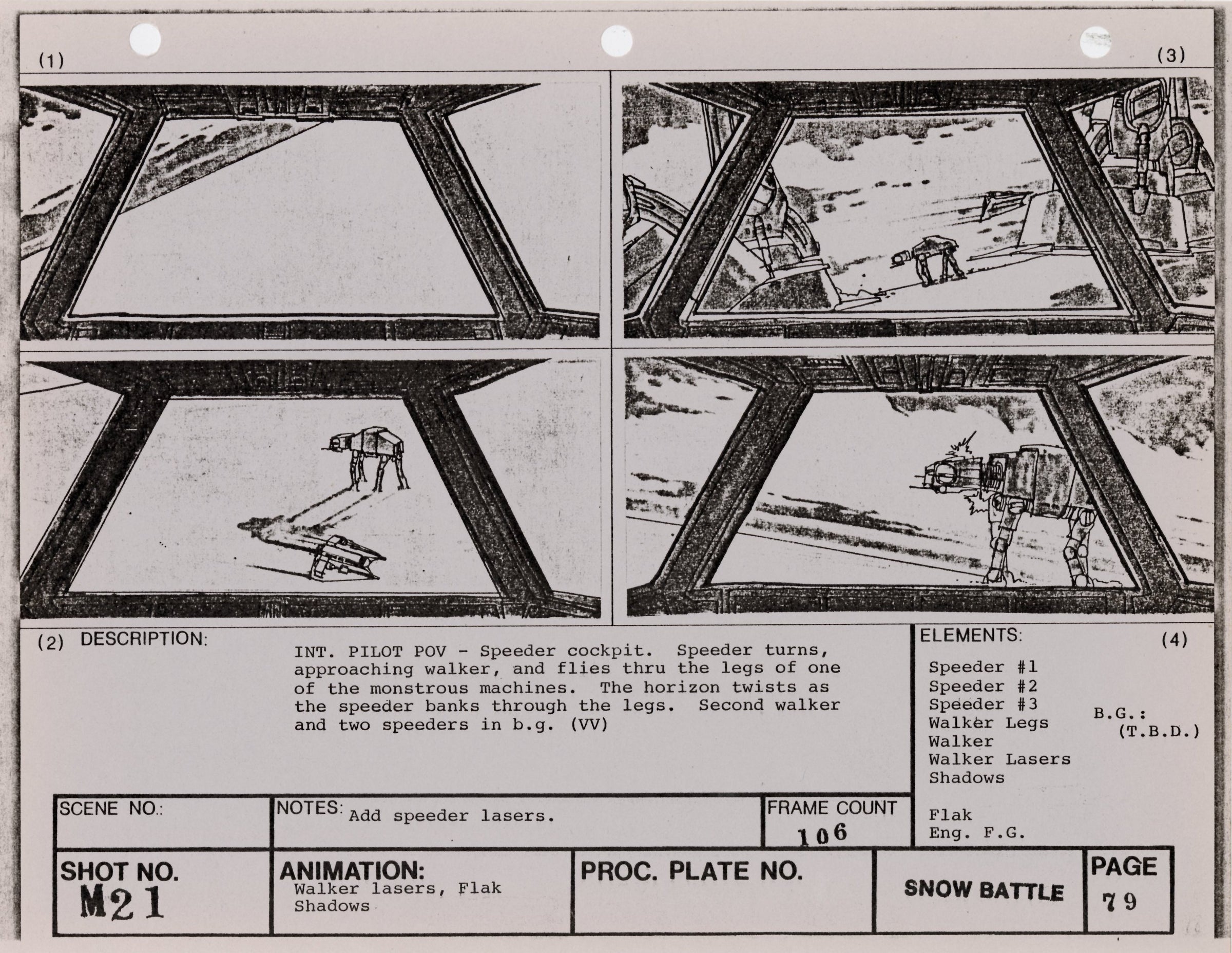 ABOUT THE ART: This storyboard print comes from the collection of award-winning miniature and optical effects artist Lorne Peterson. Peterson was invited by fellow model maker John Dykstra to work in the miniature and optical effects department of George Lucas' Star Wars: A New Hope, where he helped design and build the Star Destroyers, Imperial TIE fighters, and other classic vehicles. During pre-production, Peterson, Dykstra, and their cohort of fellow artists working under Lucas co-founded effects company Industrial Light & Magic.