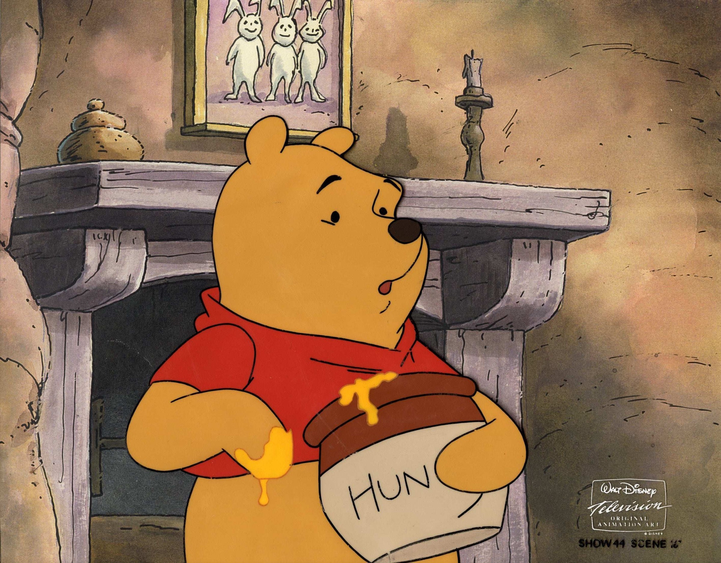 ABOUT THE MEDIUM: Original production cels are one-of-a-kind pieces of art that were used in the creation of an animated film or television show. Each has been hand-painted by studio artists on a piece of celluloid acetate, and has been photographed over a background painting to create a frame of the finished production.