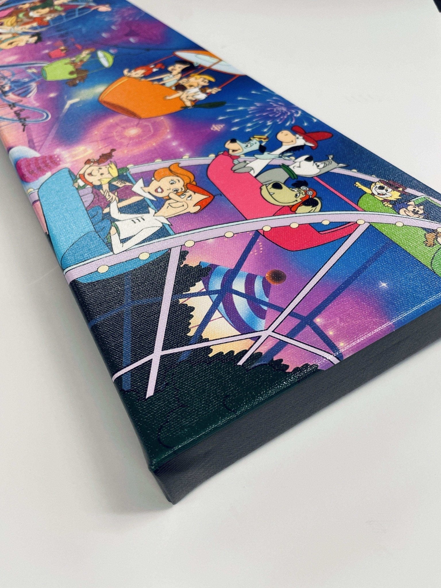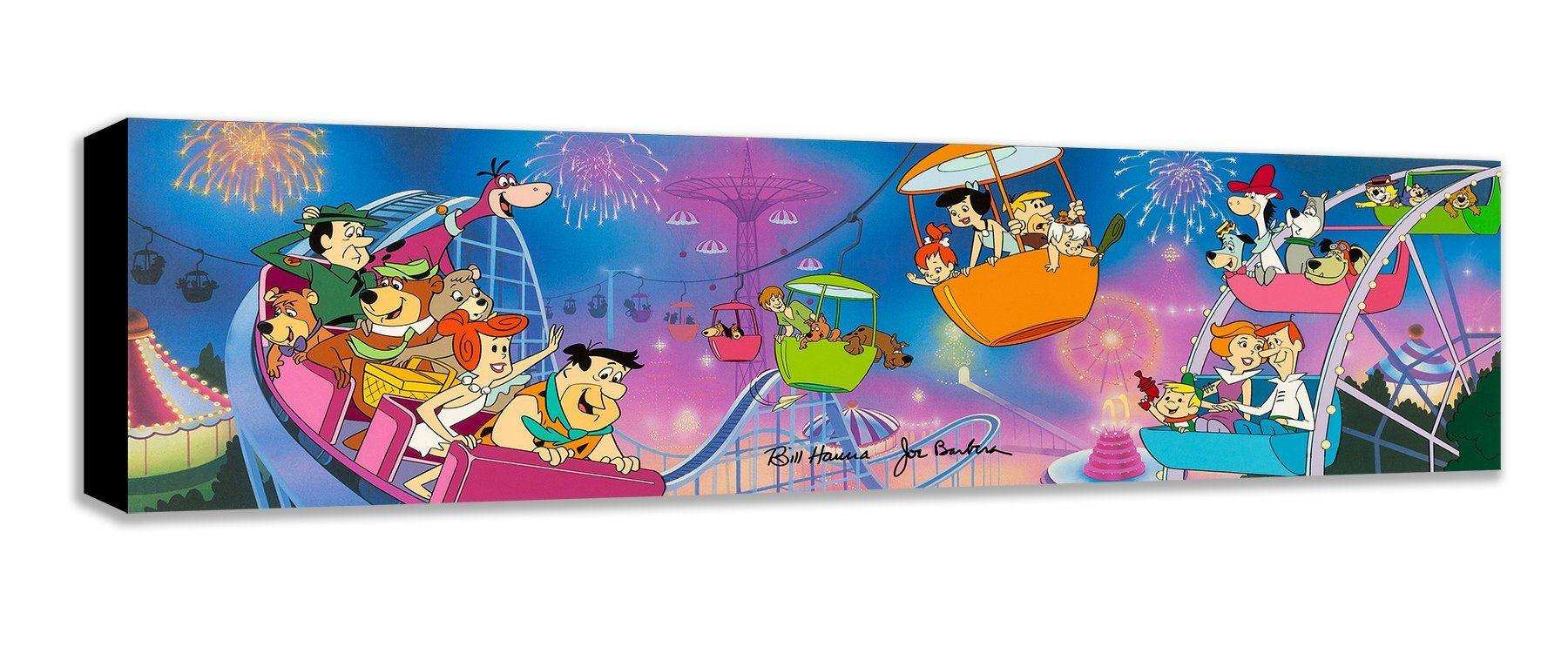 ABOUT THE IMAGE: One of the very early Limited Edition images produced by Hanna-Barbera was "Theme Park." Bob Singer did the line work for this dynamic artwork. It features 21 of Hanna-Barbera Studio's biggest stars, including characters from The Flintstones, The Jetsons, Scooby-Doo, Where Are You, The Yogi Bear Show, Top Cat, The Huckleberry Hound Show, The Quick Draw McGraw Show, and Wacky Races. Each giclée is adorned with embedded printed signatures of Bill Hanna and Joe Barbera.