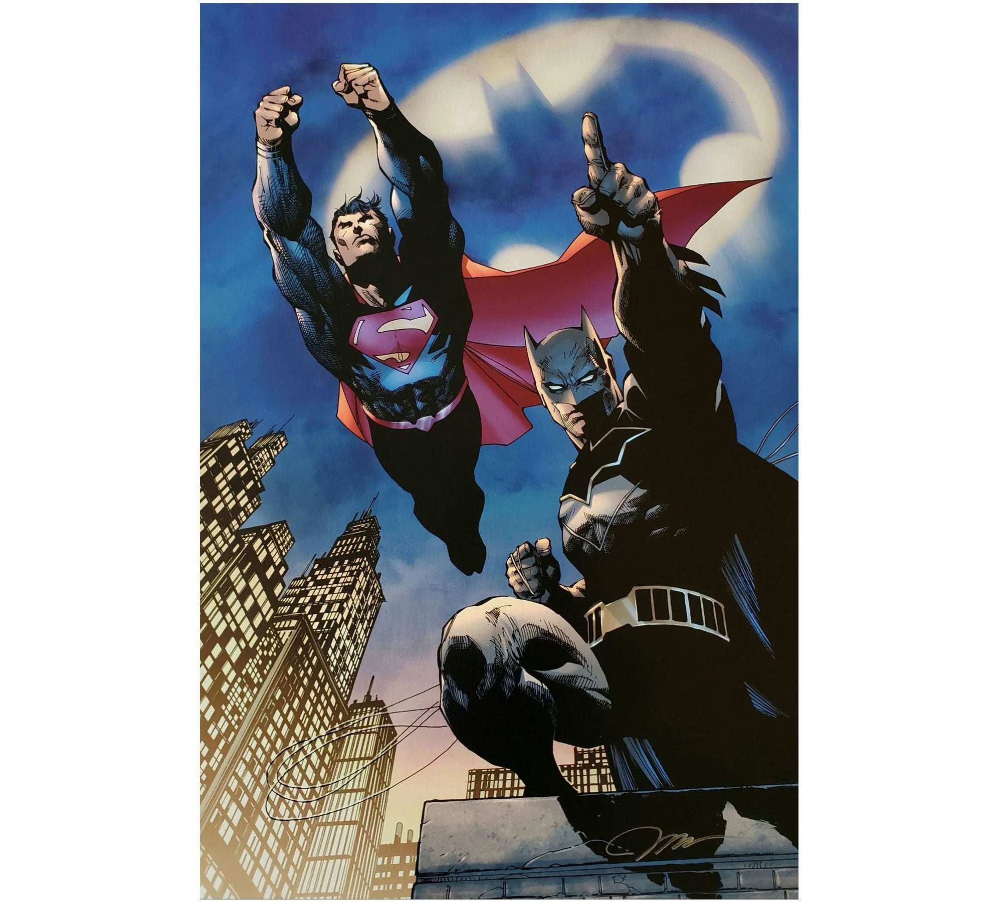 The original art for “Heroes Unite” was created for DC Comics' Batman #45. This image was issued as a variant cover to commemorate 80 continuous years of Action Comics issues. Each print is hand-numbered and signed by Jim Lee. This limited edition is being released to commemorate Batman's 80th Anniversary.