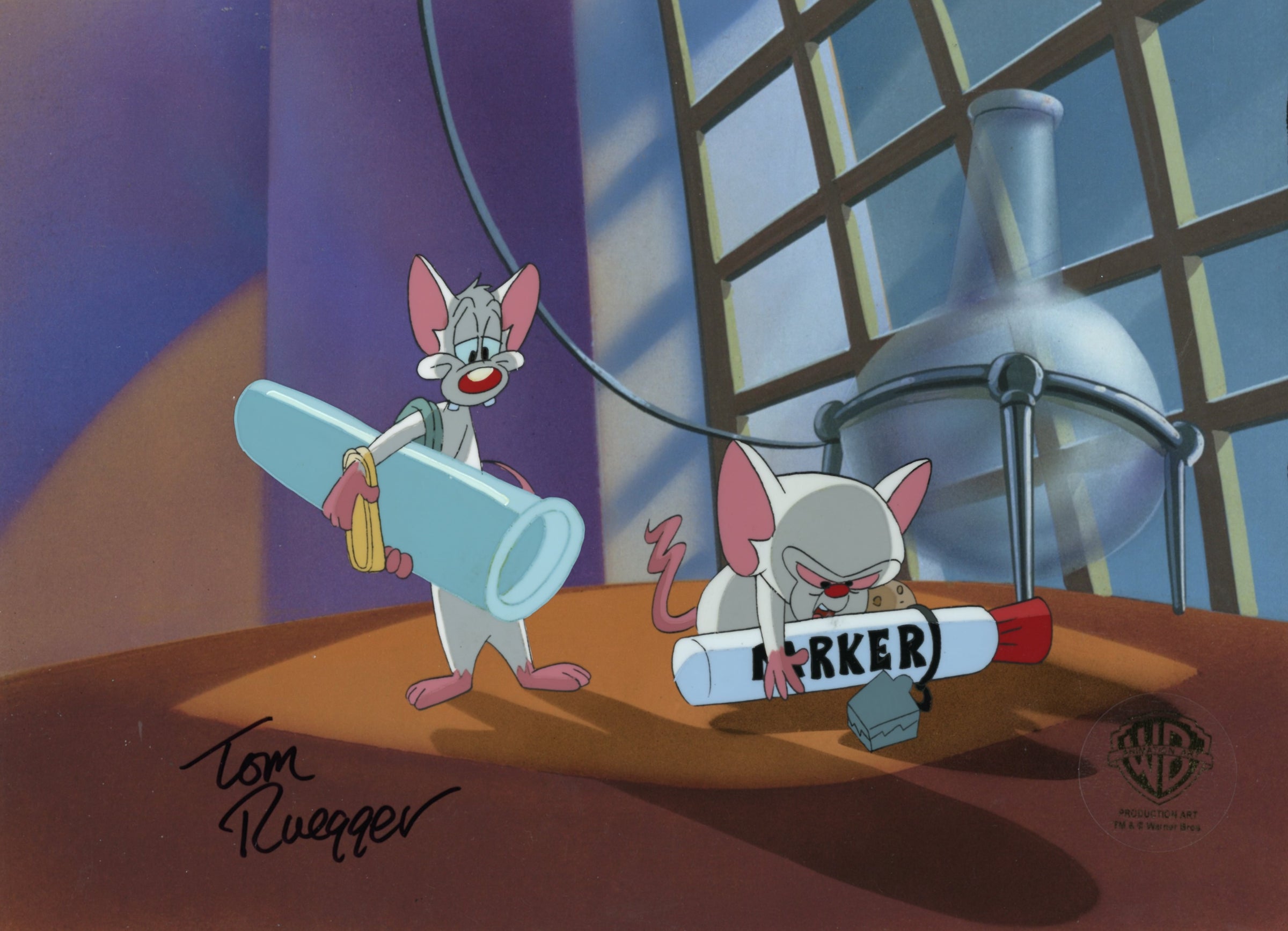 ABOUT THE IMAGE: Pinky and the Brain is a cartoon that follows a self-proclaimed genius, The Brain, and his dimwitted sidekick, Pinky, as they try to conquer the world. Pinky and the Brain was the first animated television series to be presented in Dolby Surround. It was created by Tom Ruegger and the fourth collaboration between Steven Spielberg's production company, Amblin Entertainment and Warner Bros. Animation. The characters first appeared in 1993 as a recurring skit on the show Animaniacs. Thanks to its popularity it was later spun off as a series. There were 66 episodes produced. This piece comes with a certificate of authenticity.