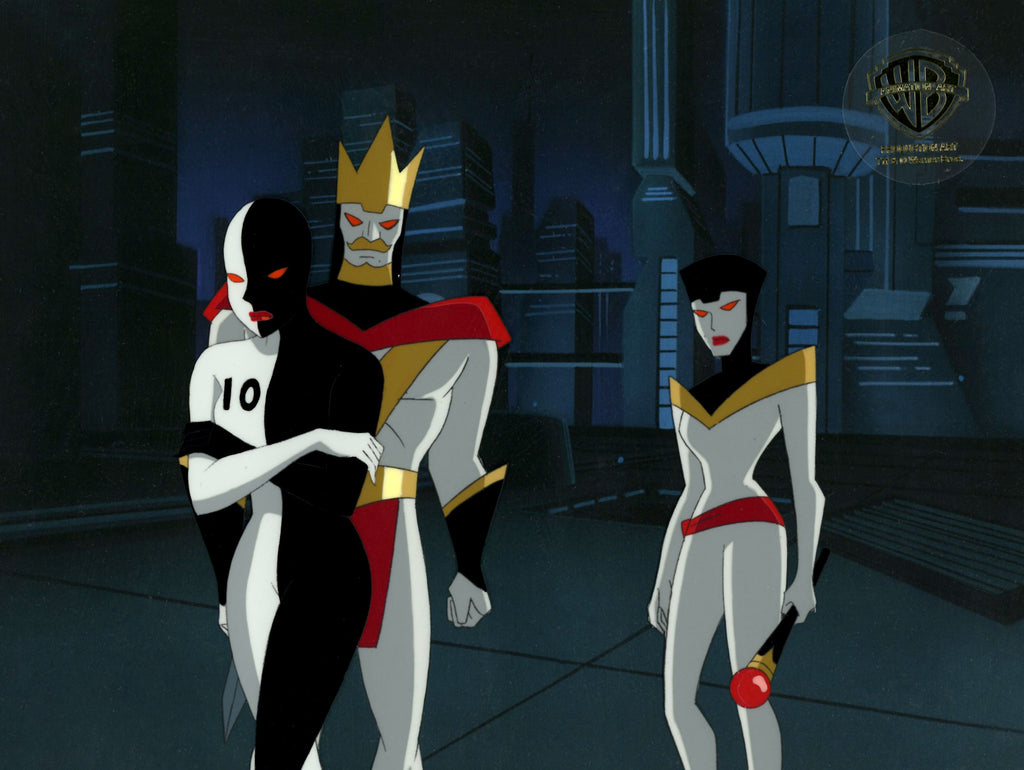The Royal Flush Gang is a group of supervillains who appear in the animated television series Batman Beyond. The gang is composed of a family of criminals who use playing cards as their motif, and each member is named after a playing card rank. The group has gone through various iterations and has been a recurring antagonist to the show's protagonist, Terry McGinnis. The first incarnation of the Royal Flush Gang in Batman Beyond is composed of a family of four: King, Queen, Jack, and Ten. They are all outfitted in high-tech suits that grant them superhuman abilities and weapons based on their respective card ranks. The group is led by King, a ruthless and domineering patriarch who will stop at nothing to get what he wants. Queen, his wife, is just as deadly and capable as her husband and is often the voice of reason in the group. Jack and Ten, their two children, are the youngest members of the gang and are fiercely loyal to their parents.