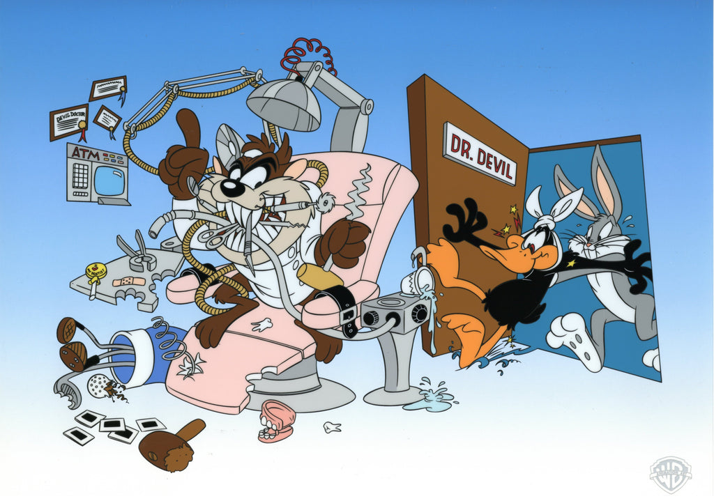 The Tasmanian Devil, often shortened to Taz, is a Looney Tunes character. Taz is generally portrayed as a dim-witted wild animal with a notoriously short temper and little patience. He will eat anything and everything, with an appetite that seems to know no bounds. Taz is best known for his speech consisting mostly of grunts, growls, rasps, and screeches, and his ability to spin and bite through just about anything.