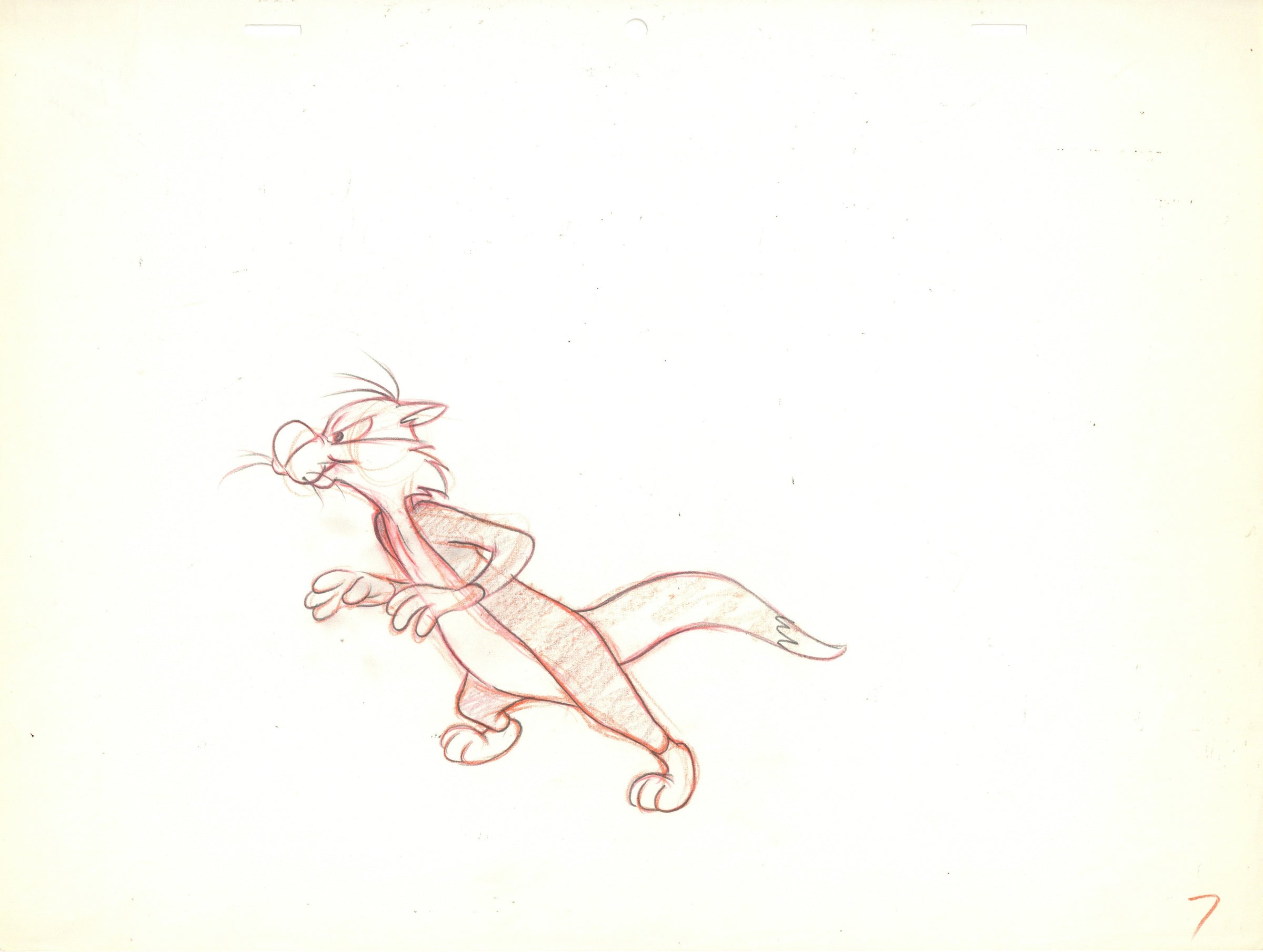 ABOUT THE IMAGE: This final animation drawing of Sylvester was created by a Warner Bros. Studio animator in the production of an animated Looney Tunes or Merrie Melodies cartoon directed by Friz Freleng, and a cel painting was made directly from it. It is likely the work of Manuel "Manny"Perez, an animator in Freleng's unit at WB from the mid 1940s to 1955.