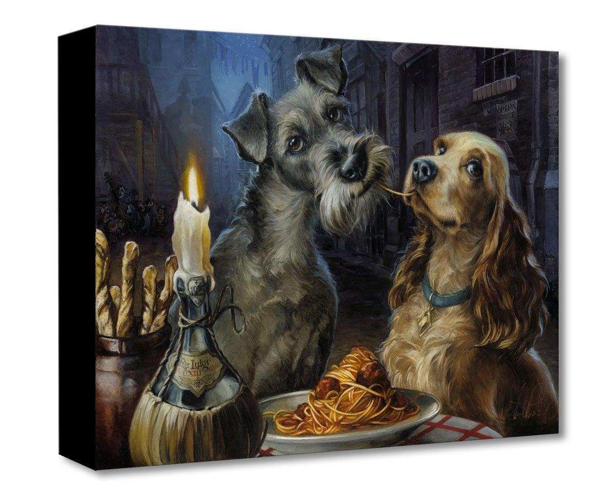 ABOUT THE IMAGE: Inspired by Walt Disney’s Animated 1955 Film Lady and the TrampLady and Tramp, as reimagined by artist Heather Edwards, share a romantic evening together, and a famous bowl of spaghetti, in this visual retelling of the most enduring scene from Disney's classic film.