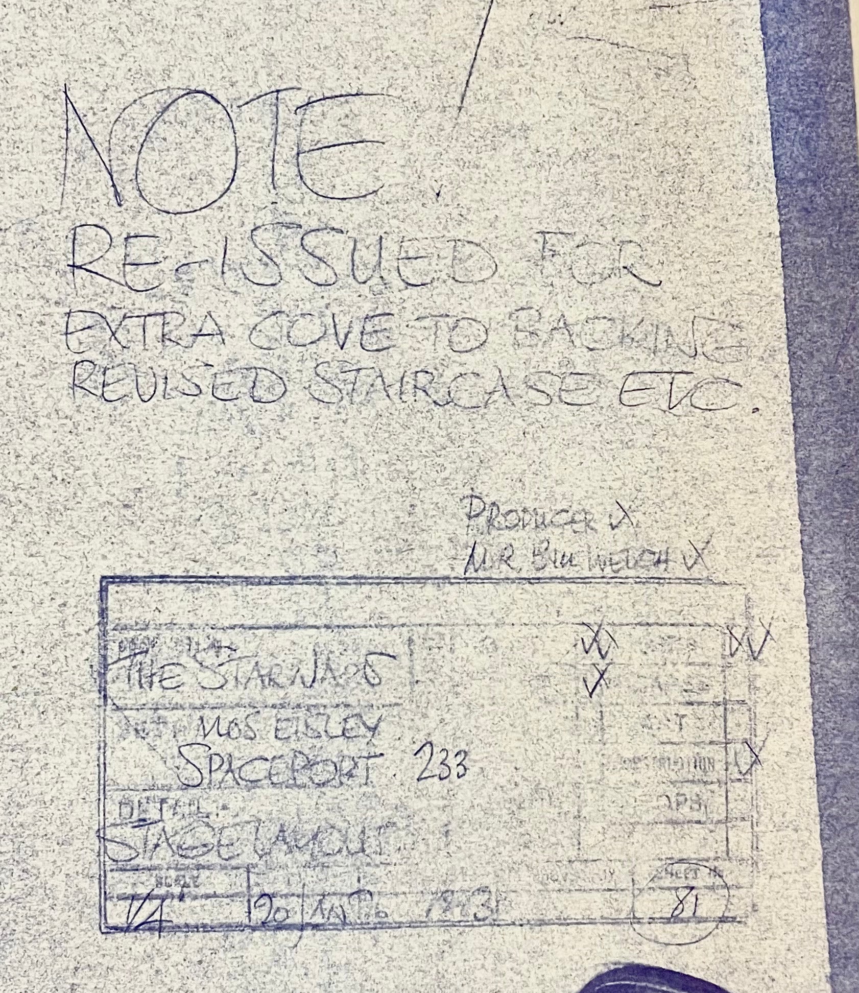 ABOUT THE IMAGE: This incredible photostat print of the Mos Eisley Spaceport on Tatooine was made from the original Industrial Light & Magic blueprint. George Lucas gave Norman Jacobs unprecedented access and permission to reproduce production blueprints for publication in his Starlog "Star Wars Technical Journals" licensed by the Lucas Org. The piece is printed from original ILM vellum on 51" x 36"blue line paper depicting an elevation of the Mos Eisley Space Port marked "Stage Layout – Mos Eisley Spaceport Set No. 233, Stage 3." It is dated, "20 Jan. 76" in the text block, which bears the working title, "The Star Wars." An outline of the Millennium Falcon also visible in the bottom half of the piece. (Exhibiting age and handling with some toning, curling, and tears to edges, not affecting imagery.)