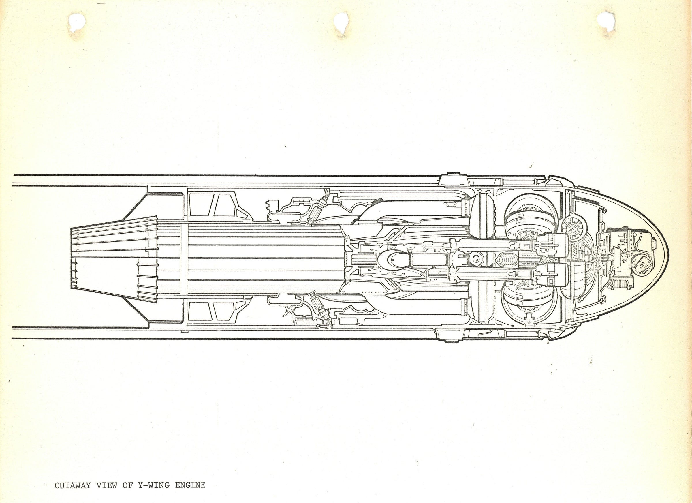 ABOUT THE IMAGE: This photostat print was used during the production of Star Wars: Episode V - The Empire Strikes Back. In this top-down engineering elevation of a Y-Wing ion engine, you can see a detailed layout of the ship's interior machinery. Please note the 3-ring binder peg holes on the upper margin of this piece.