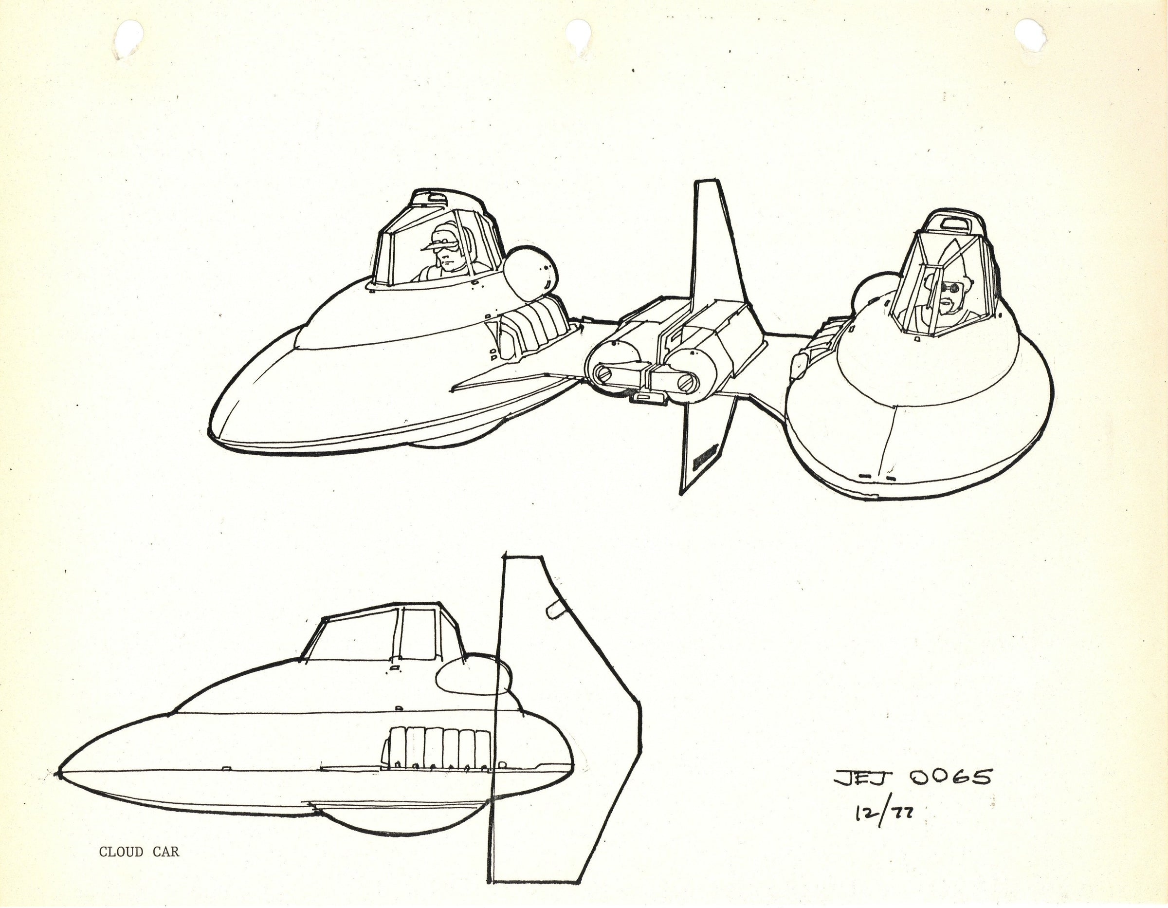 ABOUT THE IMAGE: This photostat print was used during the production of Star Wars: Episode V - The Empire Strikes Back. It depicts a front and side view of a two-man cloud car. Please note the embedded production code, date, and initials of the film's art director Joe Johnston in the bottom right corner. There are 3-ring binder peg holes in the upper margins of the piece.