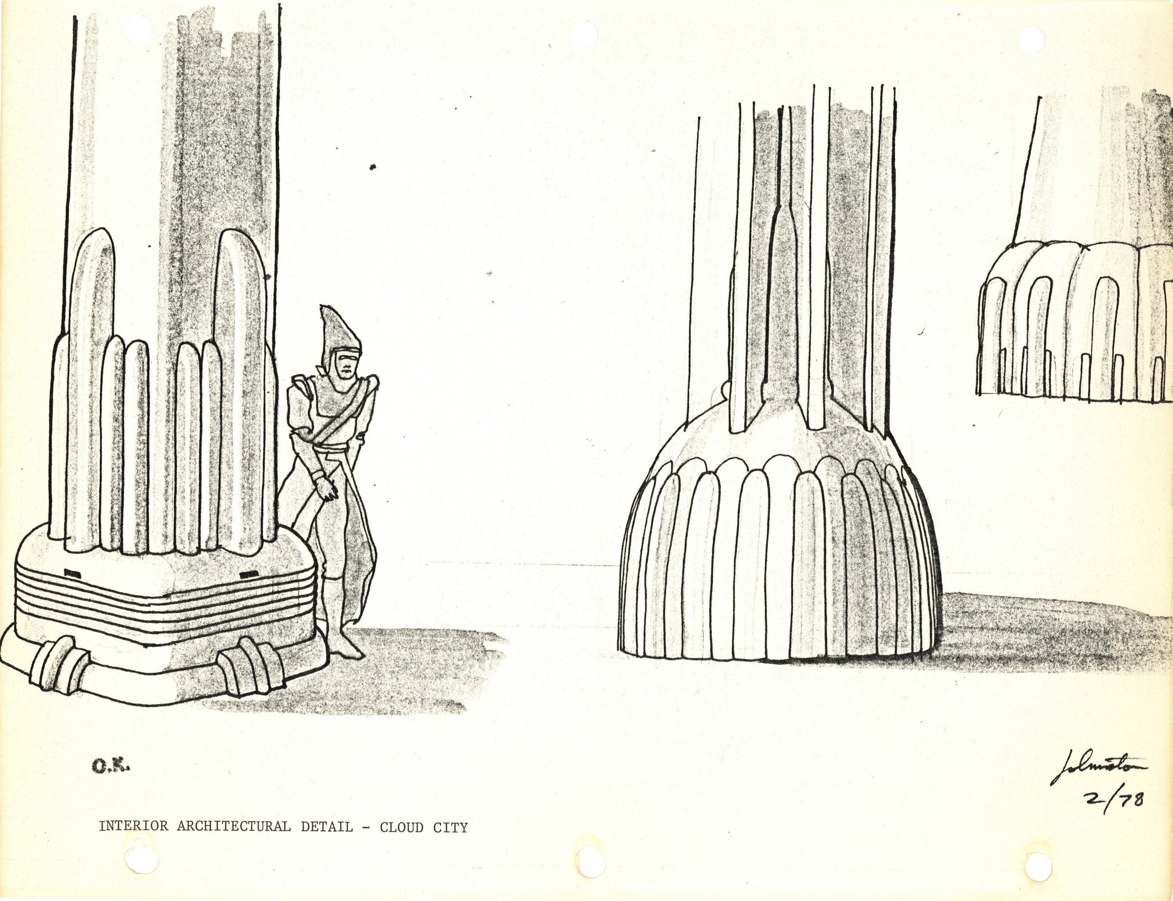 ABOUT THE IMAGE: This photostat print was used during the production of Star Wars: Episode V - The Empire Strikes Back. It depicts architectural details in Cloud City, specifically of interior columns. A Cloud City denizen can be seen walking in the background. Please note the embedded date and signature of the film's art director Joe Johnston in the bottom right corner. An "ok" stamp is visible in the bottom left corner. There are two sets of 3-ring binder peg holes on the upper and lower margins of the piece.