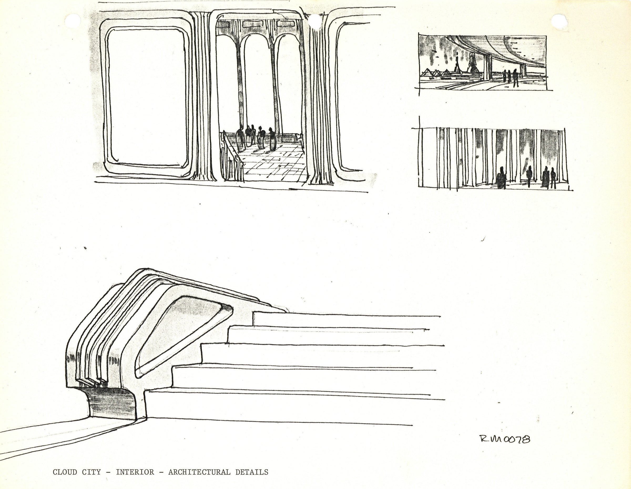 ABOUT THE IMAGE: This photostat print of an original Ralph McQuarrie drawing was used during the production of Star Wars: Episode V - The Empire Strikes Back. It showcases Cloud City's interior architectural detailing on features such as stairs, windows, and hallways. Please note the embedded production code in the lower right corner. There are 3-ring binder peg holes in the upper margins of the piece.