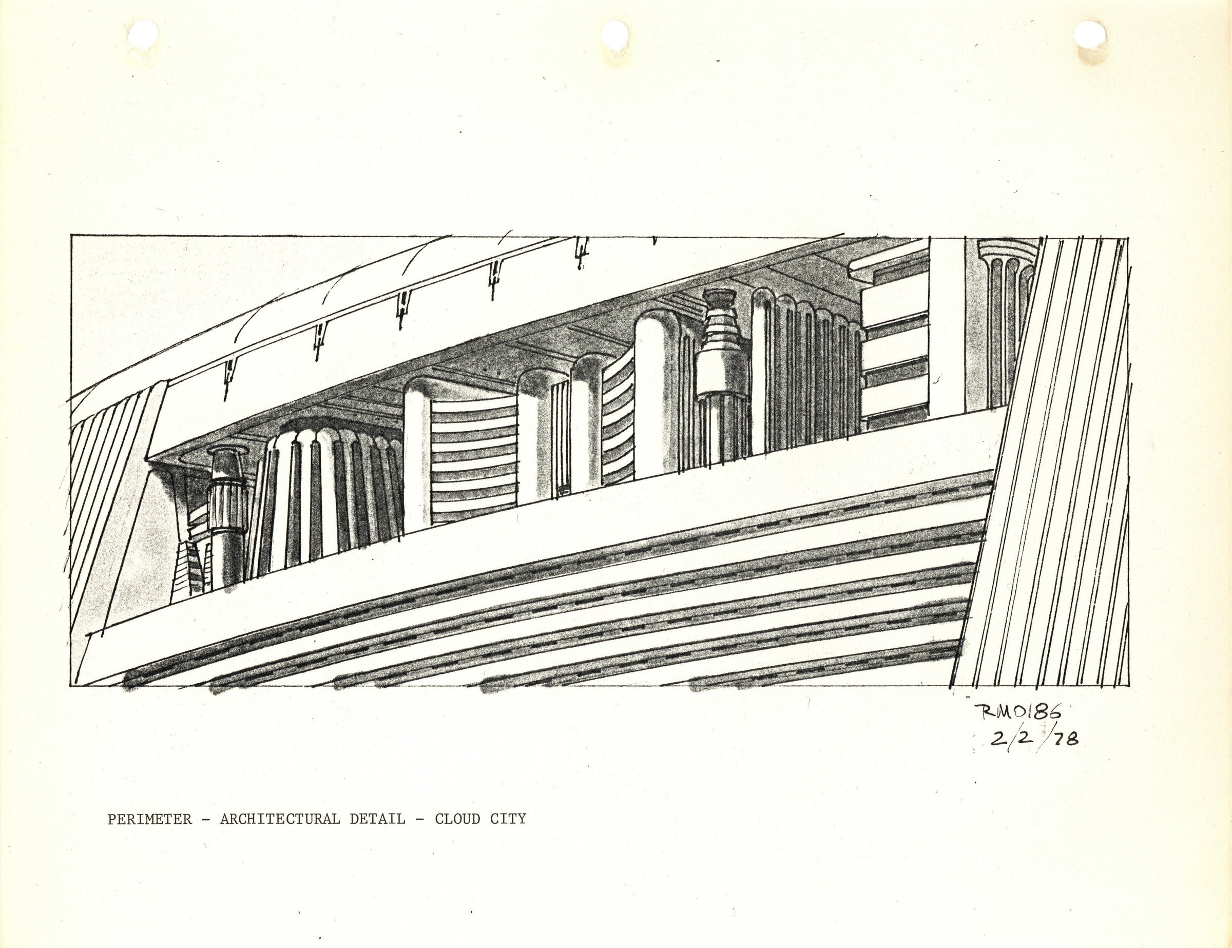 ABOUT THE IMAGE: This photostat print of an original Ralph McQuarrie drawing was used during the production of Star Wars: Episode V - The Empire Strikes Back. It showcases the detailing on the exterior structures that line the perimeter of Cloud City. Please note the embedded production code and date in the lower right corner. There are 3-ring binder peg holes in the upper margins of the piece.