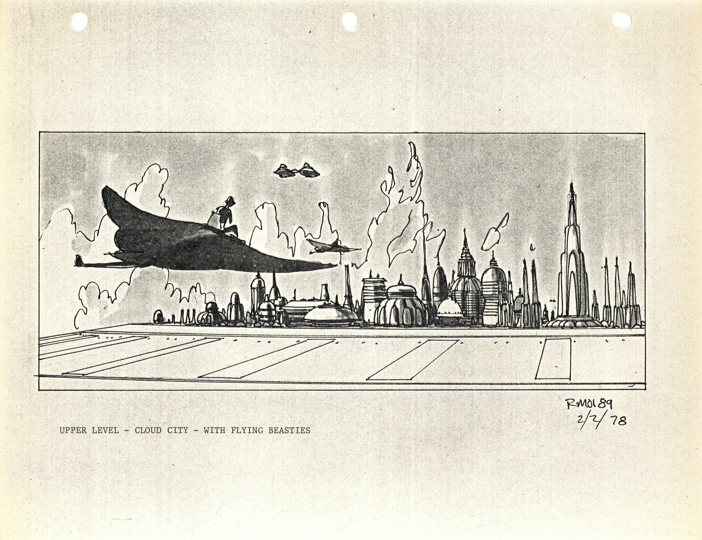 ABOUT THE IMAGE: This photostat print of an original Ralph McQuarrie drawing was used during the production of Star Wars: Episode V - The Empire Strikes Back. It shows two Cloud City denizens riding winged "Beasties" toward the upper level of Cloud City. A two-man cloud car can also been seen in the distance. Please note the embedded production code and date in the bottom right corner. There are 3-ring binder peg holes in the upper margins of the piece.
