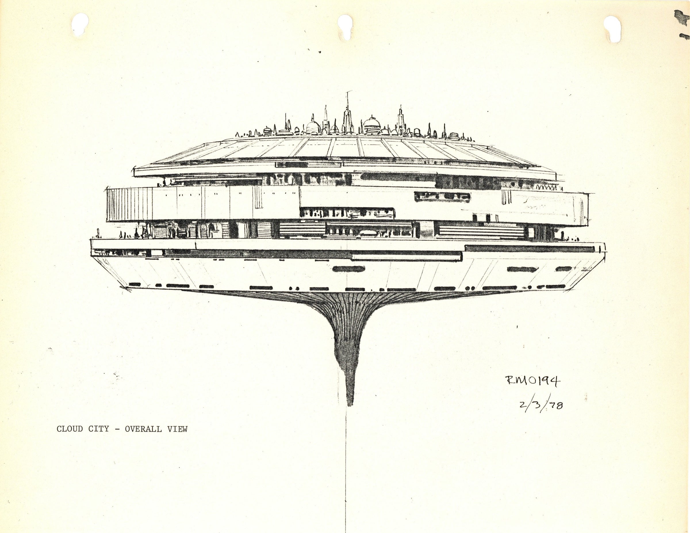 ABOUT THE IMAGE: This photostat print of an original Ralph McQuarrie drawing was used during the production of Star Wars: Episode V - The Empire Strikes Back. It showcases a full-scale view of Cloud City, illustrating what spaceships such as the Millennium Falcon would see as they approached through the clouds. Please note the embedded production code and date in the lower right corner. There are 3-ring binder peg holes in the upper margins of the piece.